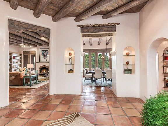 In a landscape rising to afford wonderful views of the Sangre de Cristo and Jemez mountains and studded with mature pinons, junipers and aspens, sits this elegant 3 bedroom/3 bathroom home. Introduced by an intimate outdoor courtyard, the main entry is configured generously and each tastefully designed living area radiates off this central axis. To the right is a well-equipped kitchen with butcher block and granite counter tops, five-burner cooktop and sub-zero refrigerator. A kiva fireplace warms up the casual eating area during the winter while high coved ceilings and multiple windows provide generous light and airiness in the hi-desert summer season. Both the formal dining room and the living room are furnished with diamond plaster walls, cove and beam/deck celiings, saltillo floors and large floor-to-ceiling windows that open to expansive views that also can be enjoyed from a huge portal and walled patio built directly off both areas. The master bedroom, secluded in its own wing, offers a separate sitting room, wood-burning fireplace, walk-in closet with built-in storage and walls of windows and glass doors to access the rear the portal. The master bath features a jet-tub and separate walk-in shower. To the left of the main entry is a guest wing with two bedrooms, one ensuite bath and one shared bath, a laundry room and handsome office with kiva fireplace, built-in shelving and east-facing views.