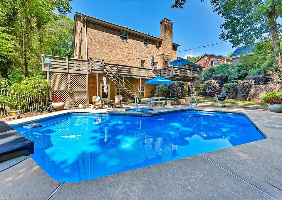 Charming 5 BR/4 BATH oasis with pool & spa! Nestled on a peaceful 1.33-acre lot with a tranquil babbling brook, where cardinals & deer make regular appearances. Imagine sipping your morning coffee by the bay window in the kitchen, watching the sunlight dance on the hardwood floors that grace the entire main level. The living room features a sliding glass door that opens to an expansive wrap-around deck. Dive into your own private oasis with an epoxy-coated cement pool and spa in your fenced backyard. Whether for family, guests, or Furniture Market renters, the walkout basement is perfect for gatherings or a spacious in-law suite. A walk-up attic ensures you have plenty of room for storage. Experience firsthand how this charming home, with its peaceful brook and inviting pool, could be the perfect backdrop for your next chapter. Ask about the sellers' $4,000 incentive!