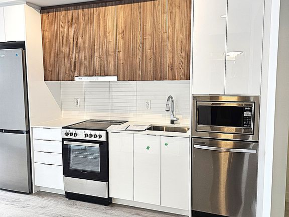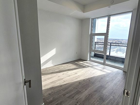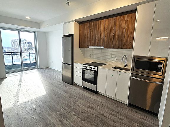 Brand New, Never-Occupied 1 Bedroom + Den with 1 Parking Space.Enjoy a modern open-concept layout with floor-to-ceiling windows that flood the space withnatural light. The contemporary kitchen features built-in stainless steel appliances, includinga microwave, and flows seamlessly into the spacious living area with walk-out to a privatebalcony. The den is generously sized and can easily function as a second bedroom, home office,or study. For added convenience, the unit includes in-suite laundry with a stacked washer anddryer. Located in a prime Markham neighbourhood, just steps to Mount Joy GO Station,restaurants, shopping, parks, grocery stores, and more. Building amenities include a main lobby lounge, self-service parcel room and parcel room, guest suite, business center with boardroom, pet wash, golf simulator, children's play room, fully equipped fitness center, party room with private dining, and a games room.
