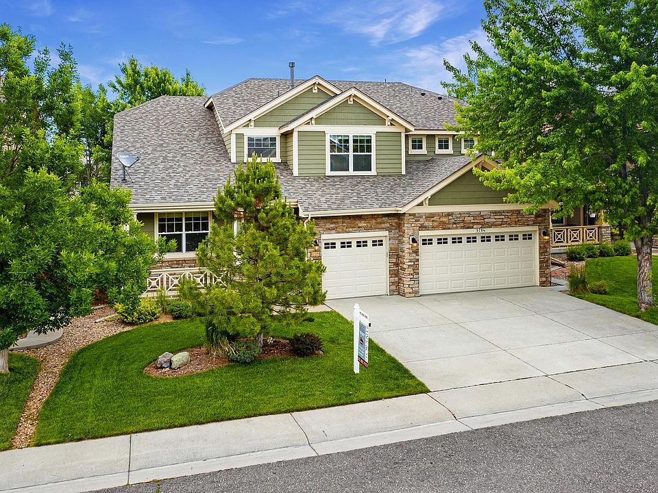 Perfect Location on a Cul-de-sac in Stonegate. Shows impeccably with immense amounts of room for the whole family. This is a Ryland Home that simply does not come available very often. Wide Plank Hickory Floors on Main Level, Large island with granite tile, double oven, gas range, maple cabinets, and built-in desk area. Main floor study is full of light and spacious for more than one desk.Formal Living/Dining has vaulted ceiling and columns to accent the finishing touches. Master is vaulted and has large windows and is wired for surround sound, large 5 piece bath, and walk-in closet. 3 Additional Beds up, 2 share a full bath with two sinks, and the other has its own full ensuite bath. Additional loft retreat area for a work station. Finished Basement with 5th & 6th bedrooms and full Bath. Large Rec area, and theatre room. Desirable Douglas School District & easy access to E-470 making for quick commutes!