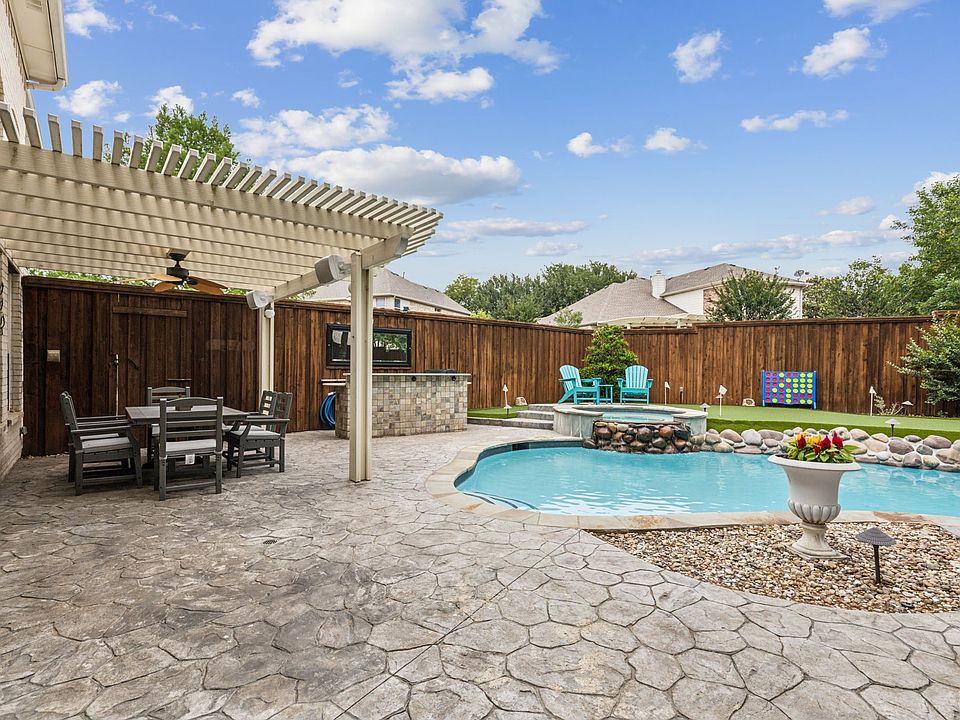 Welcome to 9786 Camino Real – a stunning, move-in ready five bedroom home offering a bright, open floorplan designed for both everyday living and upscale entertaining. Situated on an oversized lot just steps from the neighborhood park, this property boasts incredible curb appeal and a resort-style backyard. Inside, you'll find elegant stacked formals currently being used as a downstairs gameroom, rich crown molding, plantation shutters, and updated carpet throughout the spacious five-bedroom layout. The gourmet kitchen is a chef’s dream with abundant cabinetry, granite countertops, double ovens, gas cooktop, walk-in pantry, center island, and a breakfast bar that opens to the inviting family room and cozy breakfast nook with charming window seats. The family room features a gas fireplace and a dramatic wall of windows that flood the space with natural light. The secluded primary suite on the main floor is a true retreat, offering a luxurious en-suite bath with dual vanities, framed mirrors, garden tub, and a large frameless glass shower. Upstairs, enjoy a massive game or flex room perfect for movie nights or a play area. Four oversized bedrooms and two full baths finish out the upstairs. Step outside to your private paradise - complete with a sparkling pool and spa, pergola with ceiling fan, built-in dry bar with refrigerator, lush landscaping, an extended stamped and stained concrete patio and putting green with turf. There’s even plenty of green space left for pets or play. Additional highlights include a finished 3-car garage with a long driveway, a utility room with included washer and dryer and an unbeatable location near top-rated Frisco ISD schools, the UNT campus, Frisco’s pro sports venues, shopping, dining, and easy access to Hwy 121 and the Dallas North Tollway. Universal Studios is coming just minutes away - an exciting boost to this already vibrant area! Don’t miss this opportunity to own a beautiful home in one of Frisco’s most desirable neighborhoods!