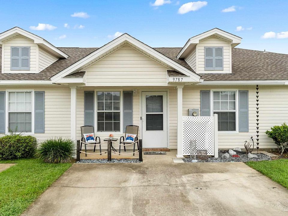 Rare opportunity to own in Hampton Lake - Charming single level residential attached home, nestled in the Hampton Lake community just off Blue Angel Parkway. This thoughtfully designed property combines comfort, convenience, and value—making it a smart choice for ALL BUYERS, including first-time buyers, downsizers, or investors seeking a strong rental opportunity. Step inside to find a bright, open, tiled, living area that flows seamlessly into the tiled dining space, and tiled kitchen. Large windows allow natural light to fill the home, creating a warm and inviting atmosphere. All of the interior light fixtures have been recently upgraded. The tiled kitchen with new cabinets and countertops and fresh paint is both functional and efficient, offering plenty of cabinet storage and counter space for meal preparation. The residence features spacious luxury vinyl floored bedrooms, with ample closet storage and well-appointed bathrooms with tiled flooring, and a new updated shower in the master Bath. A private screened in back patio featuring new exterior doors and newly installed lawn pavers provides a tranquil space to enjoy the fenced in backyard. Plenty of room for relaxation, gardening, pets, or a cozy outdoor retreat—perfect for enjoying Florida’s year-round sunshine. Beyond the home itself, this location is Fantastic. You’ll enjoy easy access to NAS Pensacola, Perdido Key beaches, and downtown Pensacola, while being just minutes from local shopping, restaurants, and top-rated schools. Whether you’re looking for a low-maintenance lifestyle, a smart investment property, or a comfortable place to call home, 9787 Cobblebrook Drive delivers it all. Schedule your tour Today!