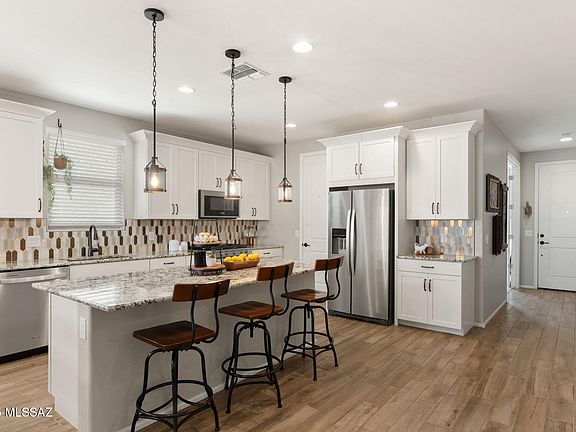 Move-in ready, two-year new Mattamy Home, in the sought-after Saguaro Trails neighborhood! Set at the back of the community the home offers one-level living in an elevated living space that balances stylish finishes with inviting comfort. Plus, you'll love the entertainers backyard nearby community amenities! Inside, you'll find soaring ceilings, neutral wood plank tile flooring, and a light-filled split bedroom floor plan. At the heart of the home, the kitchen impresses with premium finishes, gas range, pantry closet & large center island with stylish pendant lights. The connection to the living/dining room making it perfect for entertaining or enjoying a quiet evening in. Unwind in the Primary bedroom with en-suite bath boasting a large tiled shower and expansive granite top vanity. Bedrooms two and three share the guest bath while the fourth bedroom makes the perfect guest quarters with its own private bath!Head outdoors to a backyard built for both relaxation and celebration snuggle by the gas fire pit on cool evenings, entertain and mix up your favorite drinks at your Cantina, or enjoy Rincon mountain views from beneath the custom pergola.
