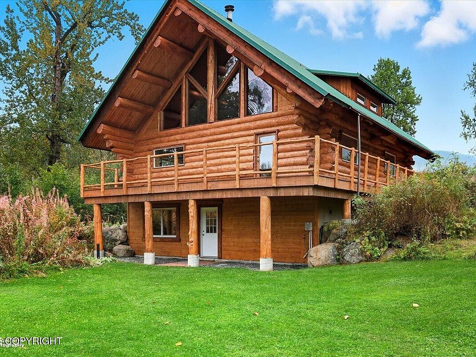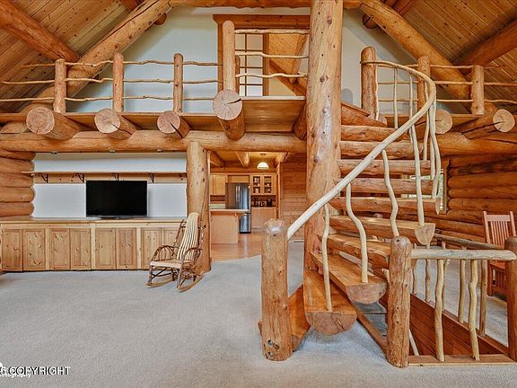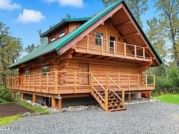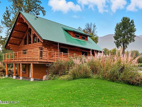 Escape to timeless craftsmanship and comfort in this idyllic 2,880 sq ft log home situated on 4.53 private acres with stunning views in the Fishhook area of Palmer, Alaska. Nestled at the base of Hatcher Pass and just minutes from Government Peak Recreation Area, this 3-bedroom, 2.5-bath, hand scribed log home offers year-round adventure with nearby skiing, hiking, and mountain biking and more!Inside... custom log details, vaulted ceilings, and a handcrafted spiral staircase create a rustic yet refined atmosphere, while natural light streams through the huge South facing cathedral windows in the main living area, and a cozy wood stove anchors the living space. The daylight basement adds bonus flexibility with an additional living space and more storage, and the expansive deck invites you to take in the breathtaking mountain views and setting. Outdoor lovers and will appreciate the established berry growing operation with over FOUR HUNDRED (400!!!) berry plants including 110+ Honeyberry plants, 300+ Boyne Raspberry plants, a large Strawberry patch along with some Rhubarb plants, and the secluded, wooded surroundings. You will be just a few minutes from *millions* of acres of public land! Whether you're searching for a private residence, second home, or Alaska lifestyle investment, this log retreat is a rare find in the Palmer real estate market.