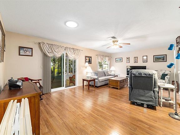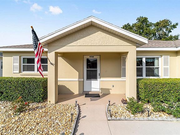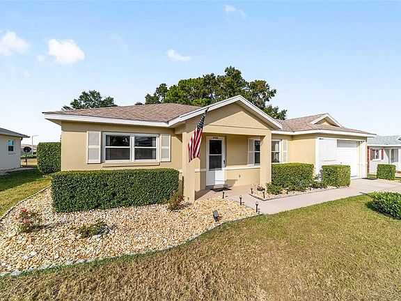 PRIVATE LOT: This Granada is the one to see! This home has been lovingly maintained and has 2 bedrooms, 2 bathrooms, and a huge, clean garage. The kitchen was updated in 2021 with refaced cabinets and pantry, epoxied counters, and glass tile backsplash. The main bedroom features a walk in closet and a recently replaced shower surround and enclosure. The second bedroom can also be used as a den with the built-in murphy bed. The lanai has been enclosed with acrylic windows and overlooks a large private yard with no direct rear neighbor. Plus, all of the big ticket items have been updated and improved like the roof (2020), HVAC (2016), water heater (2019), and windows (2010) for peace of mind. The house features laminate floors throughout meaning no carpet to maintain. This home has excellent curb appeal and can be purchase fully furnished. On Top of the World is Ocala's premier 55+ active adult, resort, golf community with golf cart access to shopping, dining, entertainment, health and beauty.