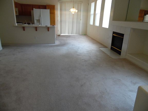 Open living room- dining room features fireplace, sliding doors off dining room into backyard which is adjacent to the greenbelt/walking trail. All appliances included!