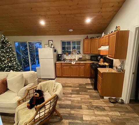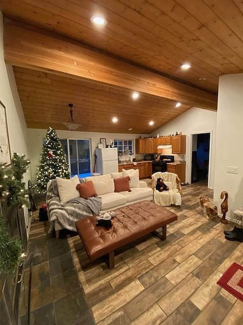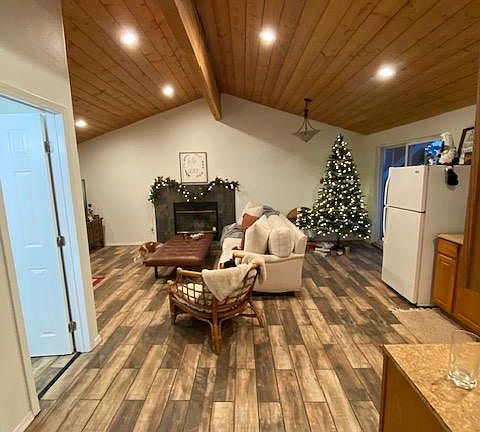 Wood burning fireplaceFenced front yardVaulted ceilings