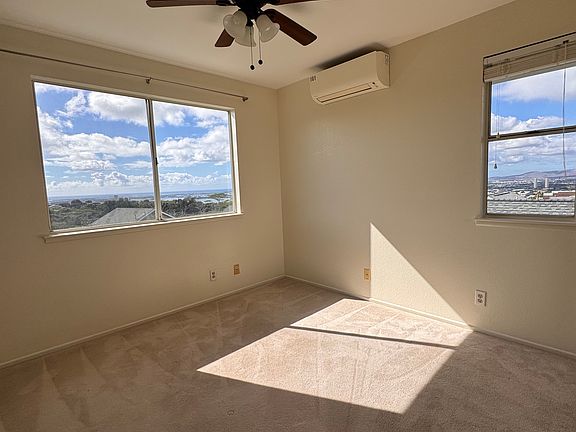 3 bedroom, 2.5 bath house up Kaahumanu st in Aiea. The Crest at Wailuna is a quiet safe community with 24 hr security, two communal pools with jacuzzi, tennis courts, and lodge that is available to reserve for small gatherings. The home has split AC for the living room, master bedroom, and secondary room. Solar panels with backup battery. Two car garage with washer and dryer. A nice size yard for a small pet. Feel free to contact us with any questions.