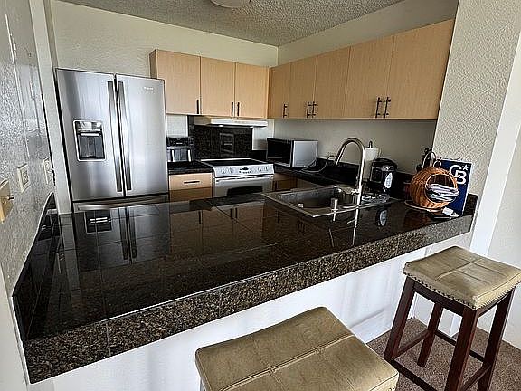 Dog-friendly! High floor, beautiful, cool, and clean air conditioned 2-bedroom, 2-parking end unit at the Pearl 2. Open kitchen space flows into the living room overlooking Pearl Country Club and mountains. Front load Samsung washer/dryer, spacious bathroom with dual sinks. Welcoming entry lobby, swimming pool, dog park, tennis courts, sauna, and guest parking!