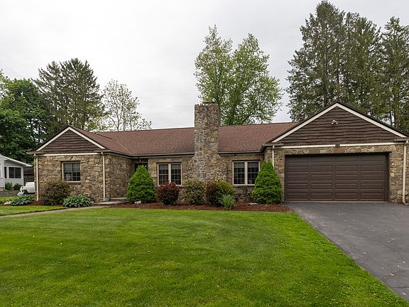 This stunning and spacious ranch-style home is truly unique! It features a large living room with fireplace, a formal dining room, and a beautiful recently renovated kitchen with ample cabinets and granite countertops. There is also an attached screened patio for comfortable outdoor dining. The home includes four bedrooms, including a spacious primary bedroom with a lovely updated bath, as well as three additional bedrooms. The lower level offers a huge family room with a pellet stove fireplace and space for a pool table or more. It also includes central air, on-demand hot water, and baseboard heat. The property boasts a beautifully manicured double lot with a heated in-ground pool and a pool house, a large storage shed, and fenced yard. This home has it all! Don't wait till it's too late!