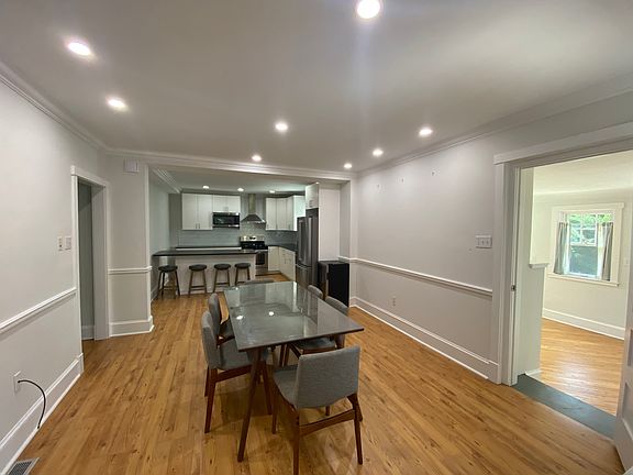 - Kitchen: A newly updated kitchen with stainless steel appliances, white cabinets, an island with stone countertops, and a dining area.
