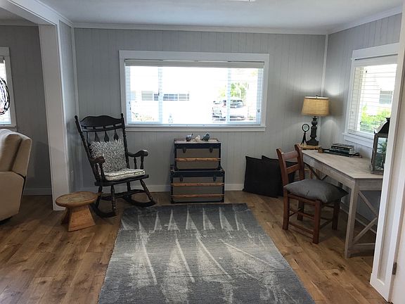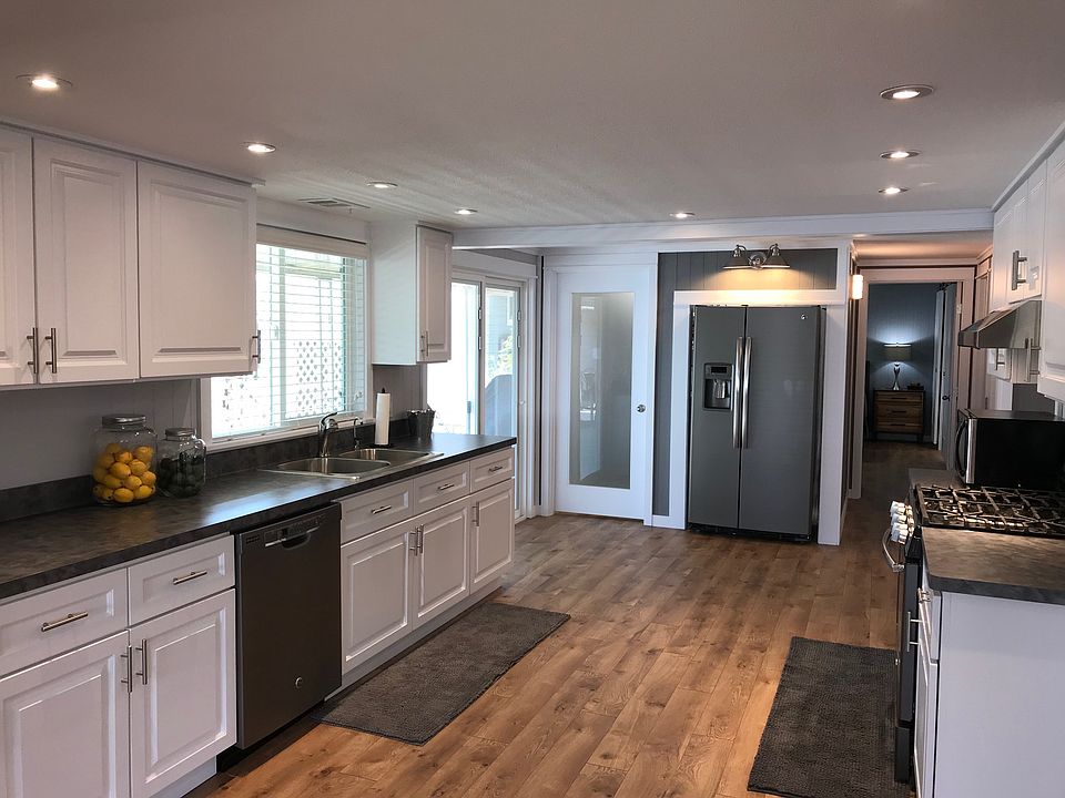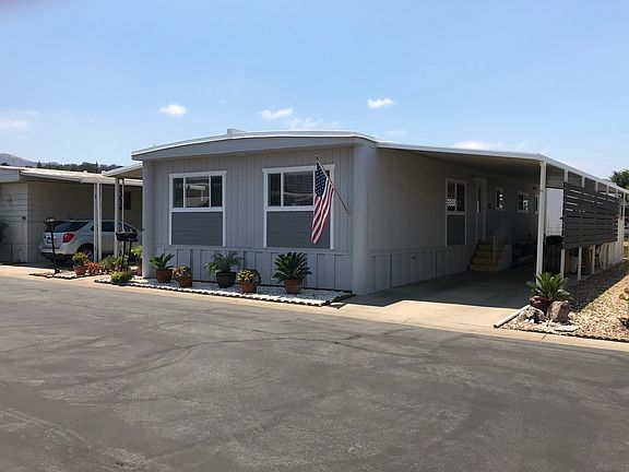 Absolutely gorgeously remodeled Manufactured Home in Senior Community with low space rent to the buyer. 2 bedroom/2 bath mountain view home. The front entry leads to the brand new large open galley style kitchen with large food pantry. Separate but open spaces for the den, dining room and warm and inviting living room. The den area can be used as a reading nook or could be enclosed to create a third room. Master suite includes walk-in closet and a large bathroom with walk-in shower. Separate laundry room has plenty of working counter space and storage. LED bulbs in all light fixtures and has beautiful wood laminate farmhouse style flooring throughout. Exterior has a reconstructed large front porch and custom-built rail with non-slip surface and fresh exterior paint all around including steps and railing in the carport and both storage sheds at the end of a large driveway. Located on the view side of the gated community. Park offers clubhouse, pool, indoor spa, huge gym, RV storage and side gate that leads to the Ojai Valley Trail.