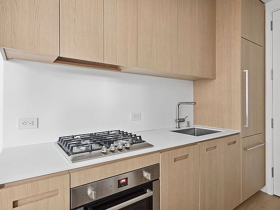 #9S offers the perfect balance of functionality and style. The open layout of this corner studio maximizes every square foot, with floor to ceiling windows letting Western and Northern sunlight to stream throughout the apartment. The kitchen features white Corian countertops and backsplashes, blonde wood cabinets, and Bosch appliances: a paneled refrigerator and dishwasher, gas cooktop, convection oven, and Grohe faucet.