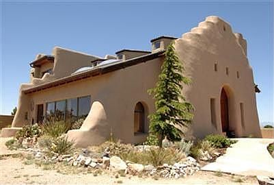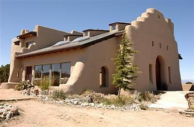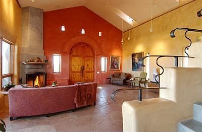 Solar and earth elements combine to create this distinctive artist-designed compound, built as an aesthetic compliment to art and nature. As featured in Su Casa and American Style magazines, the property's graceful contours add a sculptured quality to the 4,000 square foot solar adobe home, 612 square foot guest house, 800 square foot studio, and office with attached greenhouse. Serene water features compliment native gardens overlooking expansive mountain views from this high-desert mesa just South of Santa Fe along the scenic Turquoise Trail. Designed to marry the business of art to an environment that nurtures the creative life, the property maintains a constant visual interest with a high function sensibility. Beginning with the grand entry that emulates a mission church, the arched front doors lead to an elegant great room, designed to entertain and showcase art, with 19-foot high walls finished in hard-troweled plaster in rich earth shades.