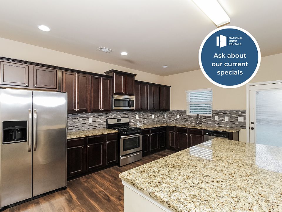 At National Home Rentals, we offer residents premier homes to meet your family's needs. This home features 4 bedrooms and 2 bathrooms with upgraded finishes and SmartHome technology to remotely control home access and temperature. Elevate your culinary journey with sleek stainless steel appliances and granite countertops, where modern meets style! The kitchen island is perfect for entertaining as you overlook the living and dining areas. The house features a spacious pantry, perfect for storing all your culinary essentials.