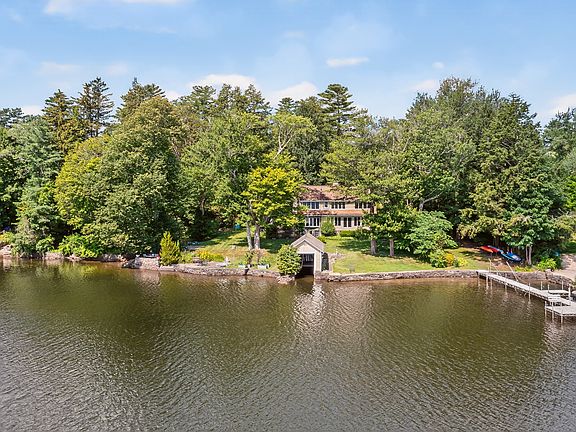 Set on one of Deer Island's largest waterfront parcels, this 1920s lake house offers approximately 3,500 square feet of living space across five bedrooms and approximately 180 feet of lake frontage. The property features mature landscaping with specimen trees, a boathouse with drive-in docking and changing rooms, a private boat launch, stone lakefront walls, beach area and a built-in outdoor grill area. Unlike many homes of its era, the interior layout is open and bright, with hardwood floors and generously sized rooms throughout. A window-lined living room with a wood-burning river stone fireplace anchors the main level, offering expansive lake views. The adjacent kitchen includes a butler's pantry and ample storage, flowing into a formal dining room framed by two walls of windows, and French doors that open to a sun-filled family room with stone accent wall. Upstairs, the primary suite features a jacuzzi tub, double vanity, and stall shower. Four additional bedrooms share a full bath and powder room. The lower level, with full-height ceilings, includes a large, windowed kitchen and a half bath, offering potential for expanded living or entertaining space. The setting ensures privacy and a quiet connection to the lake. A detached garage provides car parking and additional storage. Included in the sale is a separate, buildable lot at 90 Island Trail-offering space for future development or the option to maintain the surrounding privacy.