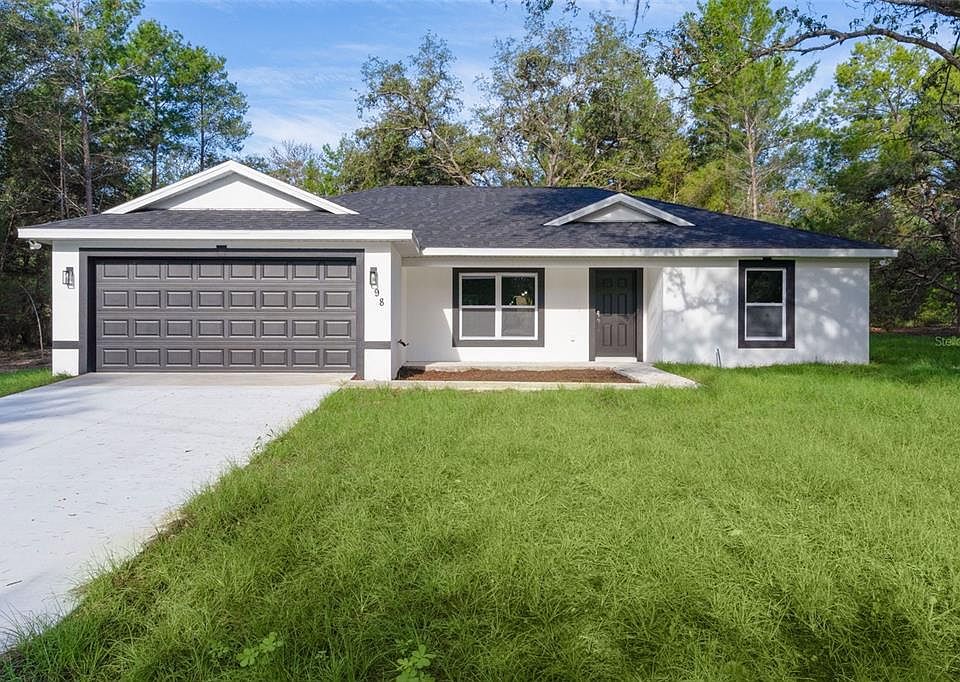 Under Construction. Just what you've been looking for! This beautiful NEW CONSTRUCTION home has just been completed in the serene wooded community of Ocklawaha, with OPEN CONCEPT and SPLIT BEDROOM conveniences and so MANY FEATURES like: QUARTZ COUNTERTOPS, CEILING FANS THROUGHOUT, CORNER PANTRY, KITCHEN ISLAND, and COVERED REAR LANAI. Upon entering the home, you will find VAULTED CEILINGS in the open entertaining area. This heart of the home combines a spacious living room and dining room with a COOKS KITCHEN, complete with corner pantry, large island with breakfast bar, STAINLESS STEEL SAMSUNG APPLIANCES, and LVP flooring throughout the home. The PRIMARY SUITE is to your left, with the 2-car garage at the front of the home, an INSIDE LAUNDRY in the middle, and the primary bedroom suite at the rear of the home. This bedroom has a TRAY CEILING with ceiling fan, a WALK-IN CLOSET, and an ensuite bath that includes DUAL SINKS in quartz countertop, a sunken CERAMIC TILE SHOWER that includes a rain shower head, and a SEPARATE TOILET ROOM. Crossing to the right side of the home, you will find the second and third bedrooms separated by a guest bath that includes a tub/shower combination, with CERAMIC TILE SURROUND and also having quartz countertop. Bedrooms 2 and 3 are of a good size and both also feature ceiling fans. Exiting through the sliding glass door of the dining area, you are protected from the elements thanks to the COVERED REAR LANAI, which also features a ceiling fan. This feature-laden home sits on the edge of the subdivision, backing up to a huge parcel, meaning NO REAR NEIGHBORS! Even though the area is wooded and feels secluded, it is situated between The Villages and Ocala, being only about 20 minutes from those locations making for an easy commute either way. This subdivision is also located between LAKE WEIR and OCALA NATIONAL FOREST, and since there is NO HOA, bring your toys! Take a look at this home, you'll be glad that you did!