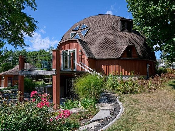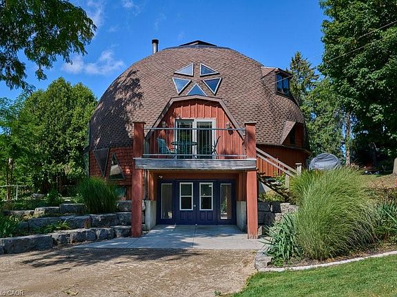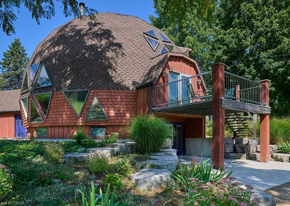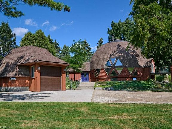 Set at the end of a quiet cul-de-sac, this Geodesic Dome offers a retreat-like setting on 3.4 acres of private land. Nearly 500 feet of river frontage stretches along the property’s edge, with your own forest walking trail following the riverbank, creating a sense of peace and connection to nature. The home itself reflects the vision of Buckminster Fuller, designed for efficiency, strength, and harmony with the environment. The 20-inch exterior walls, insulated with spray foam, provide outstanding efficiency and comfort. The bulk of the many windows face south to take advantage of the sun, while a decorative concrete block wall inside acts as a natural heat sink, storing warmth during the day and releasing it slowly into the evening. A dramatic soaring ceiling with exposed wood beams and a warm wood-clad interior create a welcoming atmosphere, with natural light flooding the open spaces and framing views of the forest and river. Adding to the uniqueness of the property, a second dome forms part of the cluster of geodesic design. This insulated garage not only accommodates vehicles, it can also be heated for use as a workshop and includes a loft space for storage or projects. The walk-out basement provides additional living area with plenty of potential to finish and customize. Water service is supplied by a well, with a cistern for gardening needs, and a municipal connection is also available if desired. Every aspect of this property blends architectural significance with everyday function. From the super-efficient dome design to the natural sanctuary along the river, this home is more than a residence, it is an inspiring place to live, create, and connect.