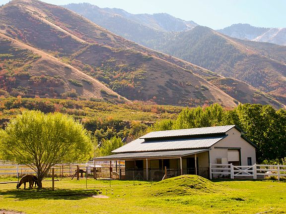 This impressive Tudor mansion sits at the base of the Wasatch Mountains next to hiking trails, and overlooking the freshwater Utah Lake. Nestled in Mature trees, with barns, and paddocks, flowering trees and secluded spots, it is completely updated with fresh paint and new carpet throughout. The two plus acres can never be subdivided, and blends among other neighboring estates, where privacy and luxury are paramount. A completely new roof, welcoming entrance with stained glass windows and inlaid wood are just the first indications of the luxury to come. Browse the photos, and then call to set a time to see this gracious home and property.