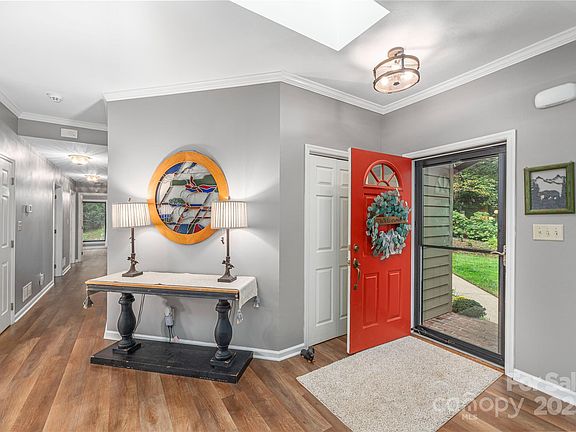 Welcome to this 3BR/3BA single-family home in the desirable High Vista community of Mills River. Nestled on a quiet dead-end street, this property offers a unique blend of comfort, storage, and entertainment. Enjoy three decks—two in the back, including a covered lower deck with a roof and gutter system perfect for rainy days, plus a front deck overlooking wooded views. A Bose outdoor sound system enhances the peaceful setting, complete with a tranquil pond and fountain. Inside, highlights include a double-sided fireplace, jetted tub, and a versatile downstairs living area that could be converted into rental income. The home boasts exceptional storage with mounted cobalt steel cabinets, built-in shelving, a workbench, and a large pegboard wall to hang tools. Car enthusiasts will appreciate garage parking for three vehicles across two spacious garages. Additional perks include a $15,000 POA membership which includes access to the pool, pub and community play area, winter mountain views, an Invisible Fence and a life size playhouse in the backyard.