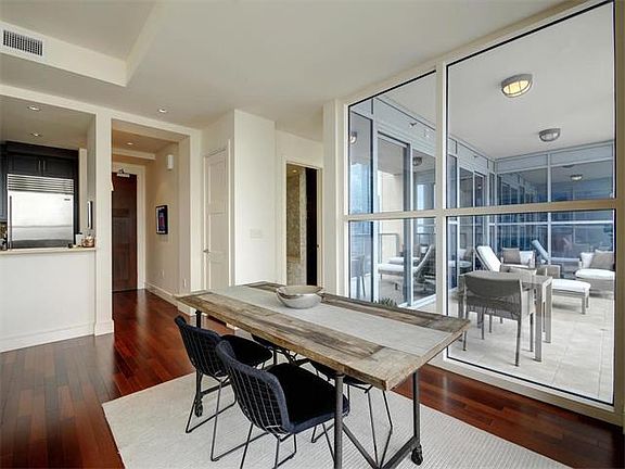 Four Seasons Residences. Spacious one-bedroom with large corner living room overlooking expansive inset balcony. Balcony is large enough for seating and dining areas. City views from every room. Kitchen open to living room. Large master bath with soaking tub and separate frameless shower. Common rooftop amenities include pool, fitness center, meeting rooms. Valet and concierge services. Room service!