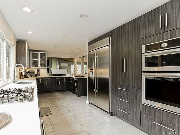 STUNNING home that is STYLISH from top to bottom. STAYCATION. Saltwater in-ground pool is a MUST HAVE; features paver patio surround, stunning stone accents, gas firepit, pool house with outdoor shower and tiki bar - huge 35'by35' deck!. The yard will make everyone envious and you'll the hero for scoring it! This cool house has been updated with all latest features. Step in to the foyer and take in this Cali-styled ranch home. Hardy bamboo flooring in ebony tone, TONS of windows with natural light pouring in from every angle, open concept will blow you away. Remodeled kitchen is super high functioning as it is impressive. Quartz counters for days, a island area that takes in the first floor openness, built-in convection ovens/microwave, beverage cooler, soft-closing doors-n-drawers, touchless faucet, compactor, this is a fully applianced kitchen calling all cooking aficionados. Kitchen overlooks the dining room & chic living room w/gas fireplace focal point. Most ceilings are shiplap with honey warm tones making the space all the more COOL. The master suite is tucked away on the back left of house with full bathroom featuring tiled surround walk in shower; soaking tub. The Cali-styled home has the lower level featuring 3 additional bedrooms and 2 separate office spaces with 2 full baths and a large open family room with tons of windows and natural light. Home could easily have 5 &/or 6 bedrooms if needed! 4 Zone Heating! Roof is a lifetime warranty completed in about 2012.