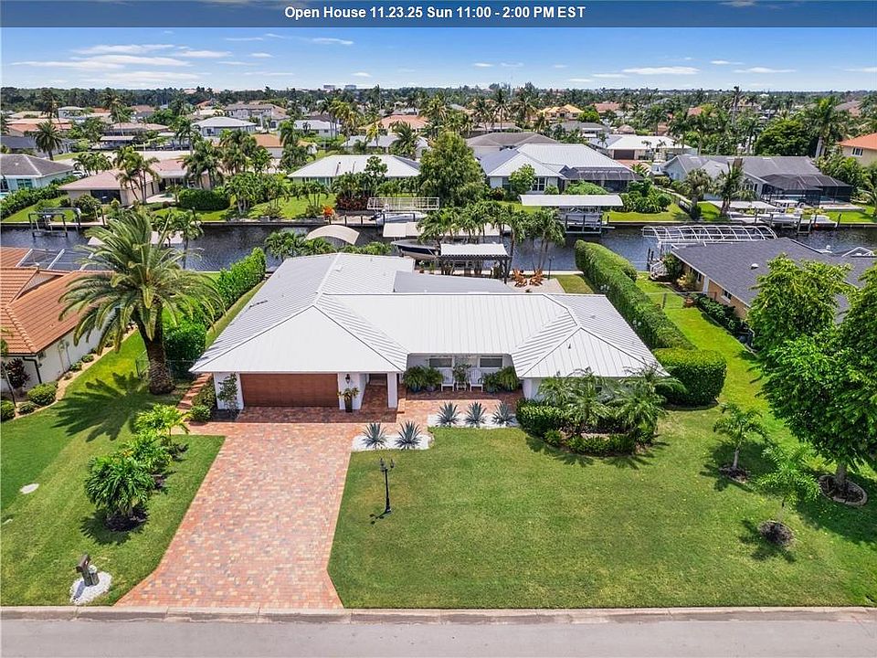 Come home to this stunning Southern exposure 4 bedroom, 3 bathroom single story home located in the highly sought-after Town & River boating community. This home features a brand NEW aluminum metal roof. Boasting an incredible backyard oasis, this property is perfect for those who love to entertain or simply enjoy the Florida lifestyle. The pool area is perfect for relaxing with family and friends, while the custom pergola lounge area provides a shaded retreat. The captains dock with 2 boat lifts, 20k and 10k pounds, both with canopies, makes boating and fishing easily accessible. Inside, the home features custom tumbled marble floors, hurricane impact sliding glass doors and windows, stainless steel appliances, and a gourmet kitchen with custom wood cabinets, and granite counter tops. This home also features a whole home solar powered system by Sunnova Home Solar Service. Don't miss out on the opportunity to make this exceptional property your forever home.