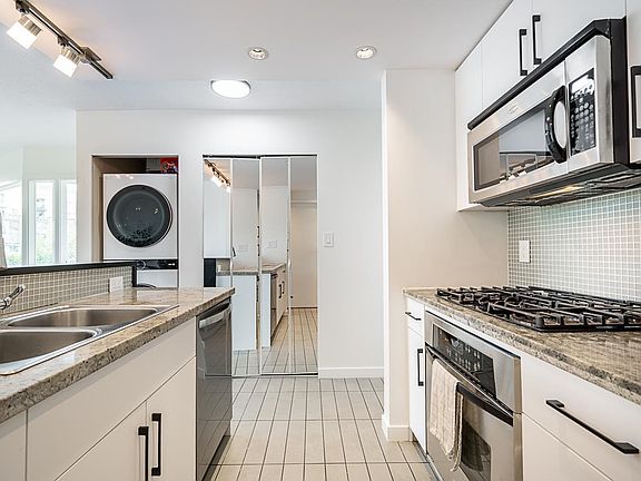 Coopers Pointe by CONCORD PACIFIC. This bright & spacious 1 Bed + Den end unit offers 730 sqft of thoughtfully designed living space. The kitchen features refinished cabinetry, granite countertops, stainless steel appliances, & gas cooktop. Recent updates include brand-new flooring, fresh paint, new washer/dryer & a beautifully updated 4-piece bathroom w/ marble countertops. Generous primary bedroom comfortably fits a king-size bed, while a bonus pantry provides valuable extra storage. Enjoy world-class amenities: concierge service, clubhouse, indoor pool, sauna/steam room, hot tub, bowling alley, 2 gyms, party rooms, theatre & more. Perfectly located on a quiet corner, just steps to the Seawall, parks, PARQ Casino, Urban Fare & Yaletown’s top restaurants. Pets welcome! Private EV Charger!