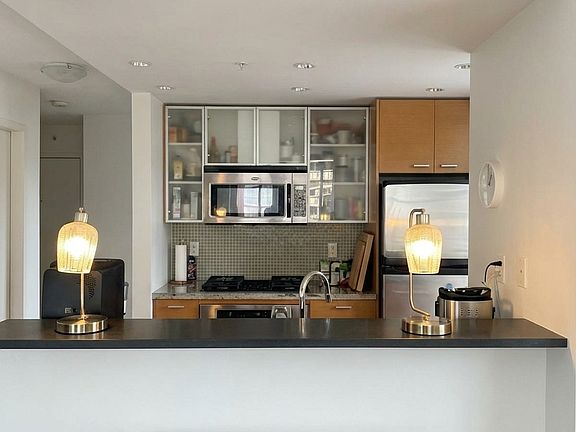 It's a bright, fully furnished 1-bedroom (730 sq ft + balcony) in Cooperage Way, in a waterfront Concord tower on False Creek. Floor-to-ceiling windows, open living space, gas range, in-suite laundry and it's already set up with everything you need bed, sofa, dining table, TV, kitchen basics, etc. Just bring your suitcase.