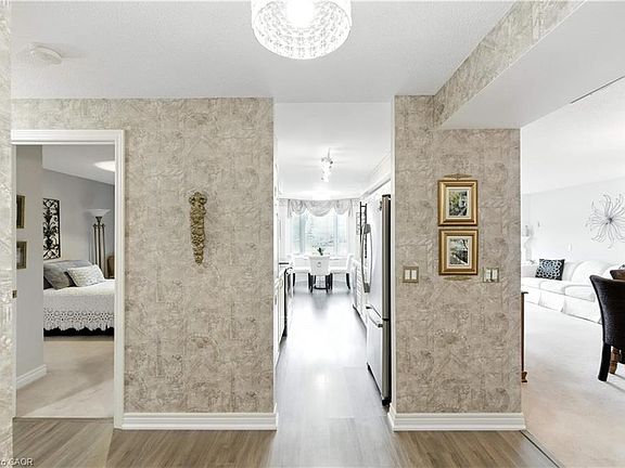 Welcome to 101-980 Golf Links Road, an exceptional ground-level condo located in the heart of Ancaster’s highly desirable Meadowlands community. This spacious and exceptionally maintained 2-bedroom, 2-bathroom unit offers 1,415 square feet of thoughtfully designed living space, within walking distance to shopping, restaurants, daily errands, and essential amenities. Step inside to a generous foyer with a front hall closet, setting the stage for a well-planned layout. The laundry and utility room, thoughtfully tucked away, offer additional storage and enhance the unit's overall functionality. The formal dining area flows seamlessly into a bright and spacious living room, featuring an oversized window & a cozy gas fireplace (sold in as-is condition), ideal for relaxing or entertaining guests. The rare eat-in kitchen is a true highlight, featuring stainless steel appliances, undermount lighting, ample cabinetry, and a bright dinette area framed by a large bay window that floods the space with natural light. Just off the dinette, a walkout leads to a private covered exterior terrace; perfect for enjoying your morning coffee. The expansive primary bedroom is a serene retreat, complete with two fabulous closets and direct access to a spacious 4-piece ensuite bathroom with double sinks and an oversized soaker tub. A modern 3-piece guest bathroom with a corner shower is situated across from the well-sized 2nd bedroom, which includes a large closet. This unit has 1 oversized underground parking space (#15) & a tandem storage locker (#15). Additional building amenities include the car wash, seasonal storage room, party room, workshop, gazebo & more. Impeccably maintained, this condo offers many recent updates including toilets, kitchen & bathroom taps/faucets, laminate flooring throughout the front hall & kitchen & more. With all the conveniences of low-maintenance living in one of Ancaster’s most walkable neighbourhoods, this is an opportunity not to be missed.