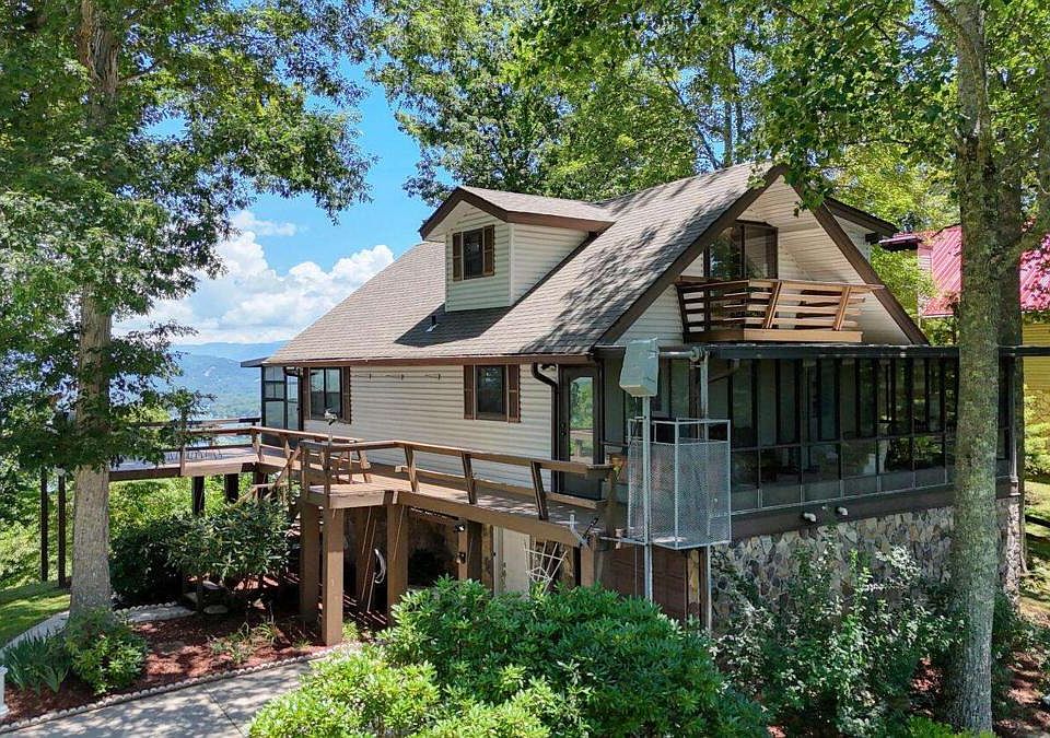 Chamber of Commerce Lake Chatuge views from this Chalet, literally! The view from this home was the cover of the Towns County Chamber of Commerce for years. First time ever offered for sale. This 3BR,3BA vintage chalet offers commanding views of Lake Chatuge to the north and east and the Young Harris valley to the south west. This home is being sold with an extra lot. Tons of outdoor and 4 seasons living area in addition to the interior home. Bedrooms on all 3 levels, stainless appliances, gas range, real fireplace with wood burning insert, detached workshop carport, basement level garage and views that are so panoramic the Chamber of Commerce made their brochure with this picture. This offering includes 2 lots( one with home, 2nd with workshop) with some of the best Lake Chatuge Views ever made. Must See, once in a generation offering.