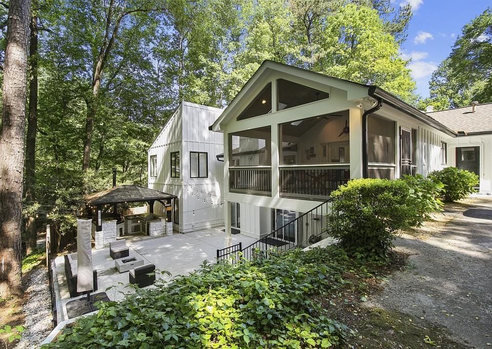 Reminiscent of a mountain retreat, this stunning contemporary home invites the outdoors in with a full outdoor kitchen including a pizza oven, smoker, gas range & grill. The generous flagstone patio and fire pit invite cozy evenings while relaxing in the privacy of your wooded backyard. A bespoke marble and quartz kitchen inspires amazing indoor gatherings or an al fresco dining on your adjacent screened patio just outside the kitchen's french doors. Enjoy your vaulted ceiling dining room or relax in the cathedral ceiling family room with two home office spaces. Master-on-main with wide plank wooden flooring plus second master on terrace level give a flexible floor plan to enjoy with beautiful quartz counters and oversized picture windows. Additional space on the terrace level with separate entrance can be finished to create a fifth bedroom and bathroom giving generous options to any buyer. This airy and open concept home can be fully enjoyed with the privacy and modern updates every buyer demands. Join the Riverside Club & enjoy tennis, swimming pool, swim team, grilling pavilion, playground, grassy play areas & year-round social events for all ages. Easy access to highways, hospitals, shopping, restaurants, and the Sandy Springs Performing Arts Center.
