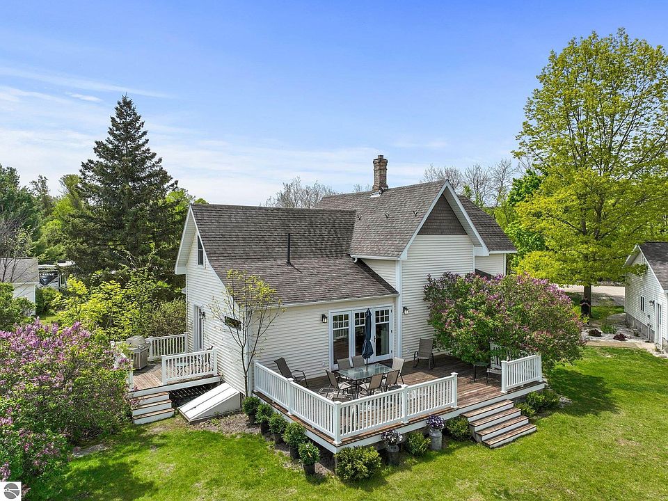 Discover this beautifully renovated 4 bed, 2.5 bath farmhouse nestled on 1.48 scenic acres in Elmwood Township just moments from the tranquil waters of Cedar Lake and the vibrant heart of downtown Traverse City. With 1,667 square feet of living space, this charming home was completely remodeled in 2019 and offers a perfect blend of modern comfort and classic character. Enjoy countryside views from the spacious back deck off the dining room or relax on the cozy front deck off the living room. Just minutes from downtown Traverse City, the property is ideally situated with the TART Trail right at the road, providing immediate access to miles of biking and walking paths. In addition to the main home, the property includes two impressive outbuildings: a detached 3 car garage with a finished gym space, and a second 3 car garage with a fully separate bonus area to use.