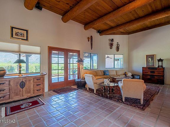 On Tucson's beautiful East Side, a warm and welcoming home on 1.5Acres (Horses allowed!) with fabulous privacy and vistas of stunning views of the Catalina Mountains is now available for discerning Buyers. A handsome pavered circular drive leads to the home. Walk up the flagstone path, through the beautifully landscaped front yard surrounded by magnificent mature mesquite trees, to a broad flagstone front terrace. Inside, a well-sized dining room and comfortable living area with Vega beams and wood plank ceilings share a double wood-burning fireplace. French doors open to a flagstone rear terrace with a delightful flower garden, overlooking sweeping views of the Catalina Mountains and its stunning peaks, including the landmark Thimble Peak. A large broad wash behind the home continues to the street behind, and provides fabulous privacy. The kitchen, with new electric range/oven and microwave, and nearly new Bosch dishwasher ( super quiet!), includes new granite counters for work space and a breakfast bar. And more great views! The ample breakfast area looks out over the front gardens and greenery. A walk-in pantry is nearby. A spacious laundry room provides storage cabinetry. Down the hall, two well-sized bedrooms share a full bath with new glass shower enclosure and "rainwater" showerhead. Another set of French doors lead to the charming rear terrace and garden. Across the home is a den/office/gym space and another full bath. The generously sized Primary Retreat, with more mountain views, encompasses a large sitting area with a third set of French doors that open to the delightful flagstone rear terrace and garden. The ensuite bath provides both tub & shower, while a walk-in closet is nearby. Floors in all public areas are whitewashed clay tiles. The two-car garage provides a wall of built-in storage and a separate storeroom. Everything for a comfortable life is either included with the home or can be easily found in nearby restaurants, shops, services and medical care. It's a welcoming community with a mix of age groups, and a delicious spot to enjoy sunsets and sunrises. You are invited to arrange your private showing.