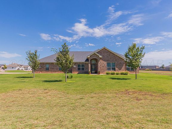 This fantastic home sits on 1 acre in the highly sought after Strawberry Fields area. The open floorplan features a very large kitchen with a double oven, gas range and walk in pantry. The oversized living area is perfect to entertain family and friends. You will find storage space throughout the home. The isolated Primary bedroom features a double vanity, soaker tub, and large walk in closet. The 3 car garage is oversized with a built in work area and storm shelter. The back patio faces east making it perfect for enjoying the cool panhandle evenings. You wont want to miss this well kept home in the between Amarillo and Canyon.