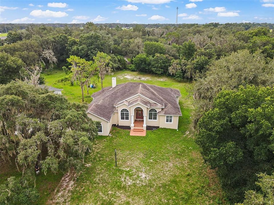 If you are looking for upscale country living with plenty of perks and privacy, look no further. This luxurious, immaculately maintained one-story estate on 11.53 acres is chock full of all the bells and whistles. Tucked away from the hustle and bustle of main roads you'll feel like you're worlds away in this custom built home surrounded by gorgeous live oaks and natural landscape. When you enter the grand foyer, you'll be blown away by soaring ceilings and bright, natural light, stunning wood-look tile floors, wide baseboards, custom lighting, gorgeous cabinetry, and large windows showcasing serene, wooded views. A private sitting room and formal dining room greet you at the front of the house and lead to a gourmet kitchen with 42" cabinets, built-in Viking stainless appliances including cooktop and oven, PLUS a walk-in pantry! You will absolutely love the secluded owners' suite with a double-sided fireplace and quick access to the lanai through a sliding door. Plus, you'll enjoy a spacious en-suite with huge walk-in closet with custom shelving, double vanities, walk-in shower, and jetted tub. There are three additional bedrooms and two full bathrooms with plenty of space for family, guests, or bonus rooms. This lovely, spacious home is built for comfortable, peaceful living and exceptional entertaining. And that is just the inside! Step outside to the grounds of the estate and you'll be mesmerized by beautiful trees, a tranquil stream, and pastoral fenced pastures. Zoned for agriculture and fitted with horse stalls and tack room, this is the perfect oasis for animal lovers. Plus, there's a 4-car garage with ample space for your other tools, toys, and prized possessions. For those who love to host gatherings for family and friends, the outdoor kitchen with tankless water heater will be a huge hit. The home also has a back-up gas generator for the entire home, two propane tanks, two wells and two septics for ultimate peace of mind. Finally, while this grand property is peaceful and private, it backs up to 39 and is just a stone's throw from shopping, attractions and entertainment, state parks and Florida's beautiful beaches. Zoned for Newsome High and Randall Middle School, it is also a perfect location for families. Upscale homes like this on such a large, gorgeous piece of land don't go up for sale often. This is truly a dream home and not to be missed. Contact us today for your private showing.