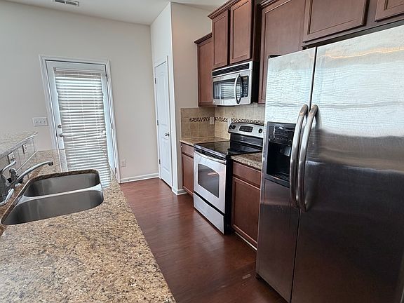 Available 10/06 small dogs OK; no cats. Lovely, lovely describes this over 1700sqft 3 bedrm/2.5 bath townhome with garage. Private back patio with storage rm is a plus. As you enter the home Hdwds greet you, gracing the entire 1st floor. Corner FP is perfect to enjoy on cool nights. Open concept design with custom kitchen, granite, SS appliances, upgraded cabinets.