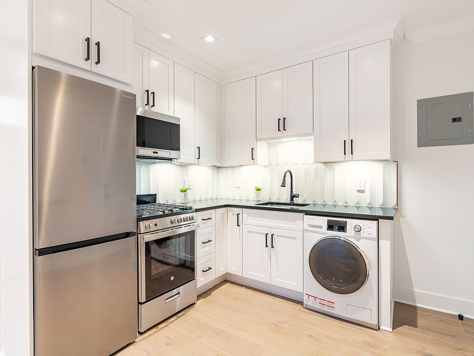 Beautifully renovated 2-bedroom with in-unit washer/dryer at 9806 Metropolitan Ave #2F. This modern apartment features wide-plank wood floors, recessed lighting, a sleek kitchen with stainless steel appliances, quartz counters, and LED under-cabinet lighting. Two real bedrooms with closets, a stylish windowed bathroom with radiant heated floors, and energy-efficient split-system heating/cooling in every room. Located steps from shops, dining, Forest Park, and transportation. Move-in ready and pristine. Cats and dogs are allowed.