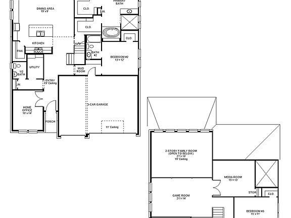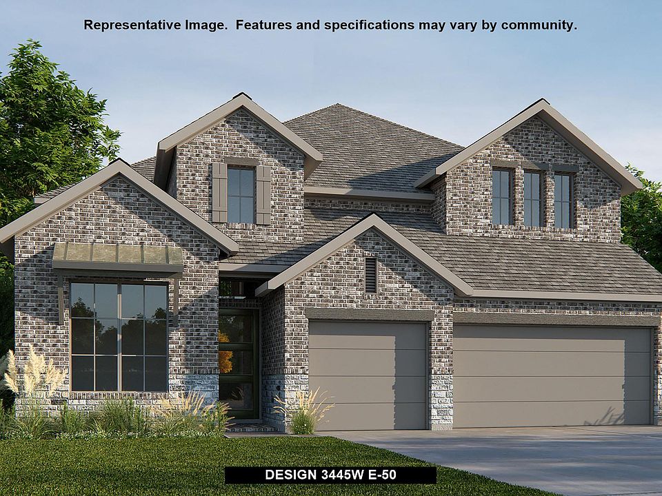 Home office with French doors frames the 19-foot entry. Generous family room with a grand wall of windows, wood mantel fireplace and a 19-foot ceiling flows into the dining area. Island kitchen with built-in seating space features a walk-in pantry. Secluded primary suite features a grand bedroom with a wall of windows. Primary bathroom offers a double door entry, dual vanities, garden tub, separate glass enclosed shower and two walk-in closets. Guest suite with full bathroom and walk-in closet on first floor. Second level hosts secondary bedrooms, a Hollywood bathroom, a media room with a storage closet and a game room with three large windows. A utility room and a half bathroom complete this generous design. Covered backyard patio. Mud room just off the three-car garage.
