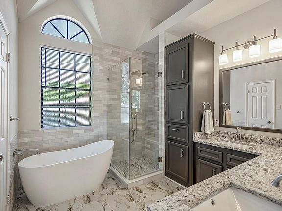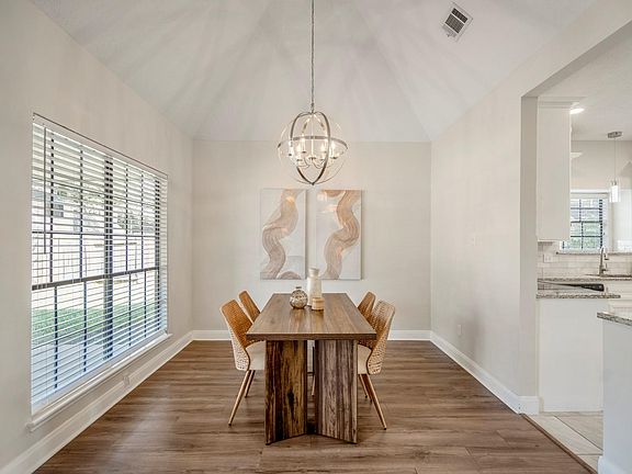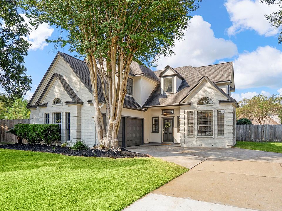 Welcome to this lovely white brick home in the community of Steeplechase! With its rich dark fascia & garage doors, this home makes a statement from the start. Step inside to find laminate wood flooring that flows through the downstairs living areas & a cozy white fireplace with a stunning mantle anchoring the open family room. The kitchen shines with granite countertops, designer subway tile, white cabinets, and a charming wine rack above the refrigerator, plus a dine-in bar and dining area with designer lighting. A cute breakfast nook and half bath complete the first floor. Upstairs offers a small living/game room, two spacious bedrooms & a full bath with granite countertops and a walk-in shower. The primary suite downstairs features laminate flooring & a spa-inspired ensuite with a freestanding soaking tub, frameless walk-in shower, with rain shower head & dual sinks. The dreamy backyard boasts mature trees, a covered patio, hot tub & deck seating. Garage has been AIR CONDITIONED!
