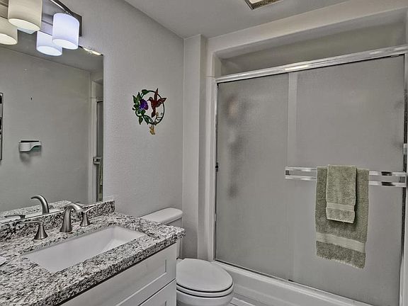 The master bedroom has a walk-in closet as well as a shower in the master bath. The guest bedroom includes a Murphy bed and walk-in closet. Both bedrooms are carpeted.