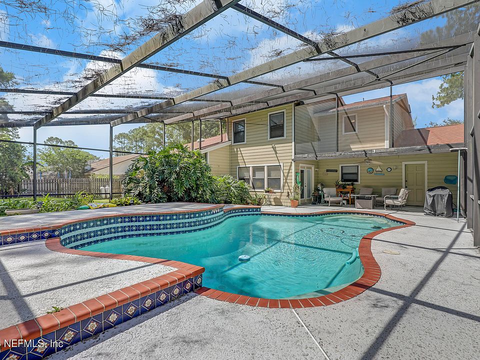 *POOL HOME*HOME WARRANTY INLCUDED*AMAZING LOCATION*Step into this SPACIOUS and uniquely designed home boasting stunning VAULTED CEILINGS with EXPOSED WOODEN BEAMS, a striking stone FIREPLACE, an accent wooden wall, and an overlooking BALCONY in the impressive living room. Walking up to the 2nd floor, you'll discover a cozy loft area, complete with a 2ND FIREPLACE, adding to the home's character. The HUGE SCREENED-IN PATIO features a gorgeous in-ground pool and views of the HUGE YARD, graced by a majestic magnolia tree. The SPLIT BED FLOOR PLAN offers privacy, while the HUGE KITCHEN overlooks the pool, perfect for keeping an eye on things while you cook. Enjoy 2 separate dining areas, a convenient laundry room with cabinetry, and a versatile second-floor BONUS ROOM. Parking is ample with a driveway offering space for an RV and a garage with PLENTY OF STORAGE. Situated in a great location, you'll love the easy access to 295 and a wide array of shopping and dining options. Don't miss out