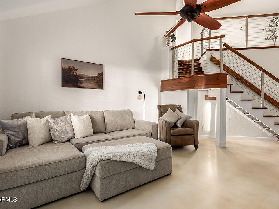 This townhome is truly remarkable! It boasts a modern, airy ambiance with stunning features such as neutral, epoxy concrete floors on the first level and a floating staircase. The staircase and landing upstairs showcase elegant Brazilian hardwood, complemented by cable railing for a seamless, open feel. Updates like interior paint, upgraded carpet in the bedrooms, newer A/C unit in 2020, granite kitchen counters, SS appliances and a reverse osmosis system enhance its allure.