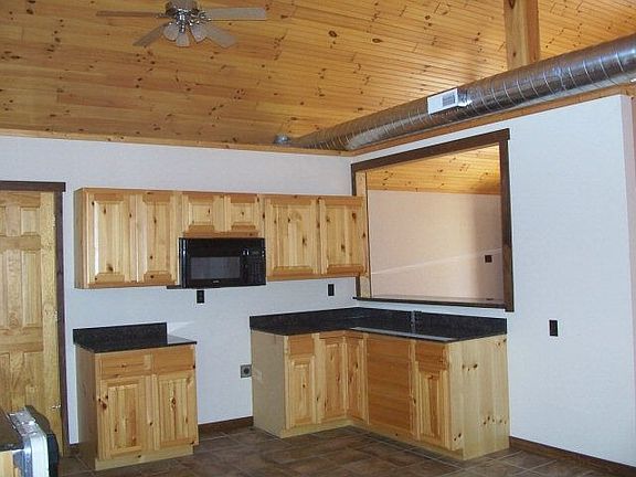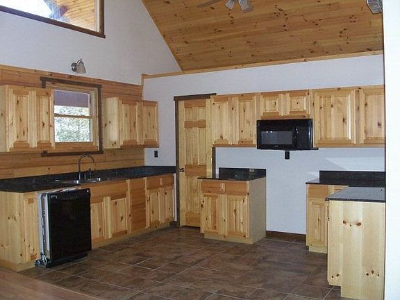 Log home in the woods, very private with a view of the Doane Ranch across the road. The home has a wonderful large kitchen with a large pantry. I think the cabinets are Hickory, microwave/exhaust fan and dishwasher in place. New furnace and air. 2 bedrooms have private bathrooms. Wood stove, backup gas heater.