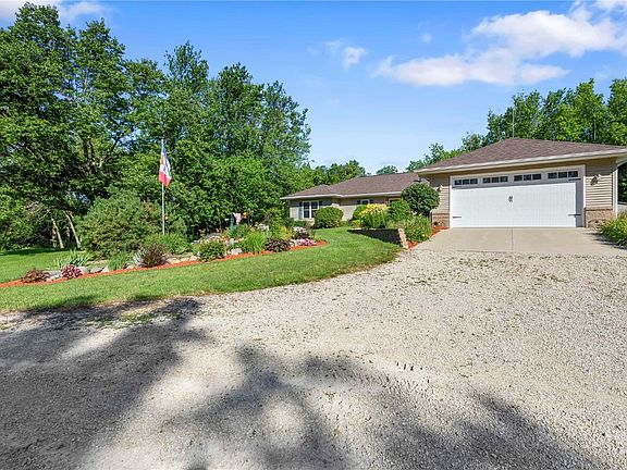 Beautiful Ranch home located on 6.3 acres just 10 minutes from Marion on a hard surface road. This home offers 3 bedrooms,2.5 bahrooms,2 full kitchens, granite counters, formal dinning with a walk in pantry and main floor laundry. The master suite offers a jetted tub, walk in shower, dual vanity, sliding door to deck,2 large walk in closets and adjoining room perfect for mediation, library, or office. You will find tile and hardwood flooring with crown molding throughout the house. The roof was replaced in 2021. There is a patio, deck, and 3 seasons porch all offering different views of the property. The walk out basement offers a full second kitchen with endless possibilities for hobbies or entertaining. In addition to the home you will find a detached heated two stall garage and a pole building plenty of storage and workspace. The property is landscaped with perennial flowers and plenty of trees to offer summer shade.