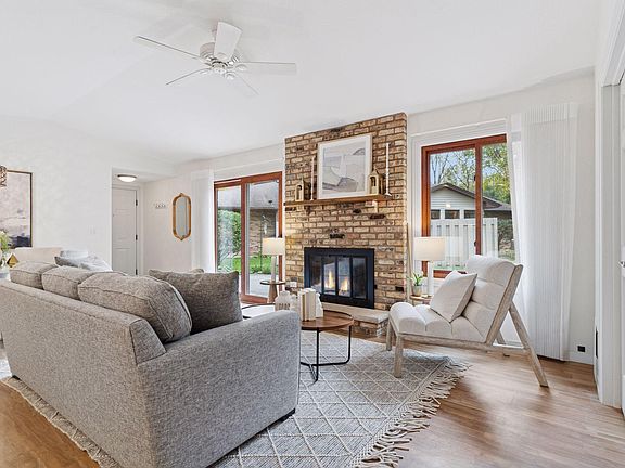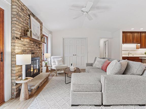 Quality craftsmanship with stylish, cohesive finishes throughout. Abundant natural light from numerous windows and doors. Open-concept layout with vaulted ceilings and focal point brick fireplace with mantel. Accessibility & Comfort. True one-level living — no stairs, no barriers. ADA-compliant: wide doorways, tasteful grab bars, and a roll-in shower
