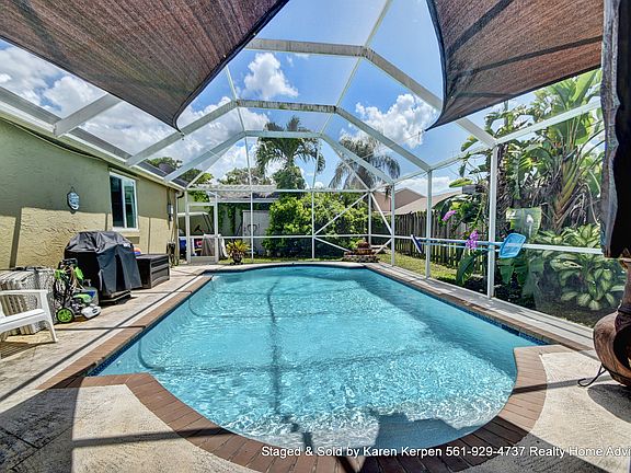 Property Under Contract. Please call me Karen Kerpen/Realty Home Advisors at 561-929-4737 for more info on how I can get your house under contract too!!! Charming 3 bedroom/2 bath/POOL home. Featuring an open floor plan w/vaulted ceilings, impact glass doors/windows & laminate flooring throughout. Updated kitchen w/granite counter tops, subway tile backsplash, SS appliances & wood cabinets. Both bathrooms are updated. French door leading to the HUGE/screened in/salt water pool!! Fenced in yard w/gate that opens double wide. Patio has covered area too! You can relax & entertain in this fabulous backyard! Newer roof from 2007. Custom built in closets. Amazing schools! Pet friendly community! Low HOA fee $139 a month includes Olympic size community pool, kiddie pool, tot lot, basketball, racquet ball, lighted tennis courts, jogging paths & more!