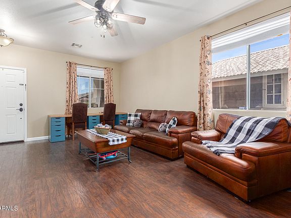 This is a must see, spacious 4 bedroom, den, and 2.5 bath family home located in the beautiful Augusta Ranch Golf Club community. This home showcases multiple upgrades throughout including granite countertops, updated light fixtures, smart thermostat, Ring doorbell, wood laminate flooring, outdoor smart watering system and paid off owned solar panels with no transfer fee that are sure to save on future power bills. Enter into a welcoming living area that flows into a family room and dining area featuring a beautiful bar countertop seating area. Off the kitchen you'll find a large walk in pantry adjacent to the laundry area and a half bath before entering a spacious 2 car garage with additional space for storage and/or a workshop. Enjoy your privacy as all bedrooms are located upstairs with 2 full baths that provide quiet space away from the first floor living area. You can also enjoy the comforts of outdoor living with an inviting, well landscaped backyard and patio area that includes a large gazebo off to the covered patio. Not to mention the beautiful golf course, restaurant, and 4 recreational park areas inside the Augusta Ranch Community.