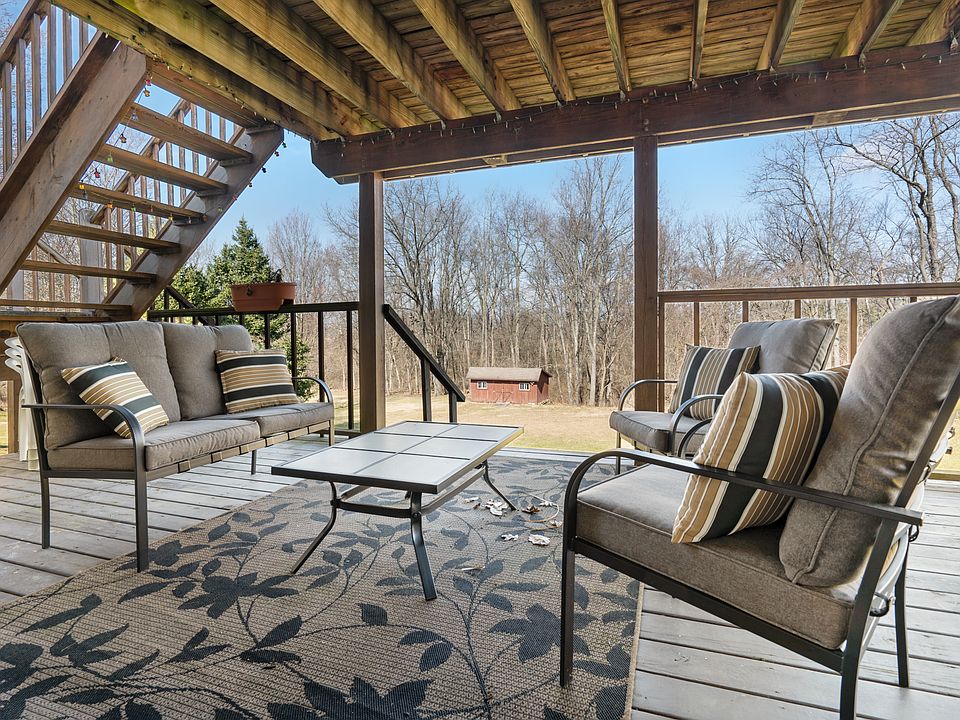 Furnished apartment with large private walk out deck to yard and firepit. New kitchen and bathroom/laundry rooms. Standard appliances, kitchen has pots, dishes flatware etc. Towels and linens provided. Private and quiet neighborhood. Individual parking spot. Close to interstate. Close to walking trails.