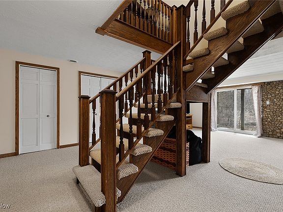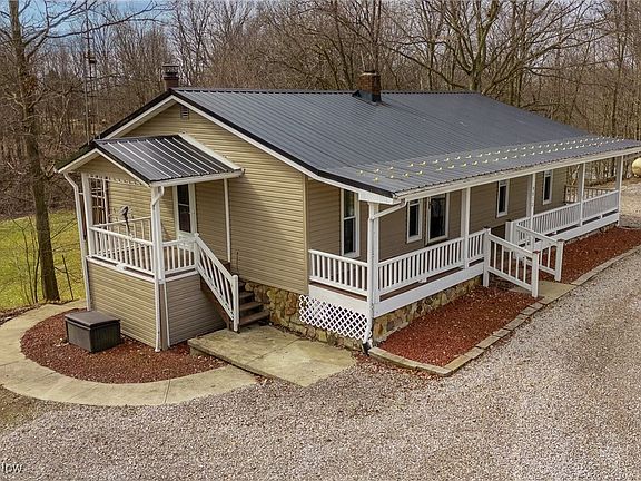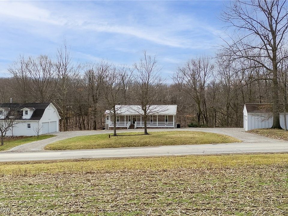 Discover the perfect blend of rustic charm and modern comfort in this beautiful country ranch, nestled on a picturesque wooded lot with rolling terrain and a meandering creek. This inviting home offers a large covered front porch, cozy main-level living, with a unique open staircase feature complemented by a finished walkout basement, providing additional living space, a fireplace and easy access to the great outdoors and additional patio space. The property also includes two versatile outbuildings. One with a 24x32 loft, perfect for storage, a workshop or hobby space. The second 24x24 with an overhead garage door offers heat, electric and water. Enjoy nature at your doorstep with mature trees, open spaces, and plenty of room to roam. This rare property offers the tranquility of country living & plenty of space for entertaining all while remaining conveniently close to modern amenities and Interstate I-71 almost half way between Ohio's great cities of Cleveland and Columbus. Don’t miss this opportunity—schedule your showing today!